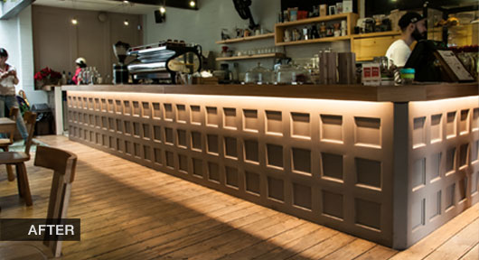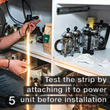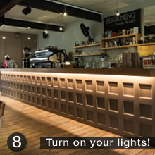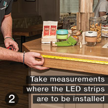 Installing LED strip lights is simple and can be done in a few steps. Consult an electrician before working with electricity and contact us with any questions throughout the process. Below is an example of an installation we did at a coffee shop.The change from halogen lamps to LED strip lights not only saved energy, but looks much more beautiful.